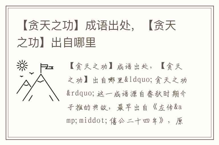 “贪天之功”这一成语源自春秋时期介子推的典故,最早出自《左传·僖公二十四年》,原文为“窃人之财,犹谓之盗,况贪天之功以为己力乎?”。它的字面意思是把上天的功劳据为己有,现多用来批评将集体或他人的成就归功于自身的行为,带有强烈的贬义色彩。