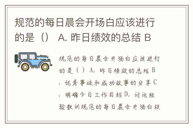 规范的每日晨会开场白应该进行的是() A. 昨日绩效的总结 B. 优秀事迹和成功故事的分享 C. 明确今日工作目标 D. 讨论经验教训