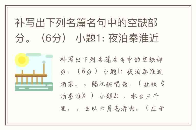 补写出下列名篇名句中的空缺部分。(6分) 小题1: 夜泊秦淮近酒家。 ,隔江犹唱花。(杜牧《泊秦淮》) 小题2: ,水击三千里, ,去以六月息者也。(庄子《逍遥游》) 小题3:况吾与子渔樵于江渚之上, ,驾一叶之扁舟, 。(苏轼《赤壁赋》)