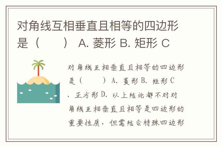 对角线互相垂直且相等是四边形的重要性质,但需结合特殊四边形的定义准确判断。菱形对角线仅垂直不平分,矩形对角线仅相等不垂直,正方形虽满足对角线垂直且相等,但这并非唯一满足该条件的四边形。