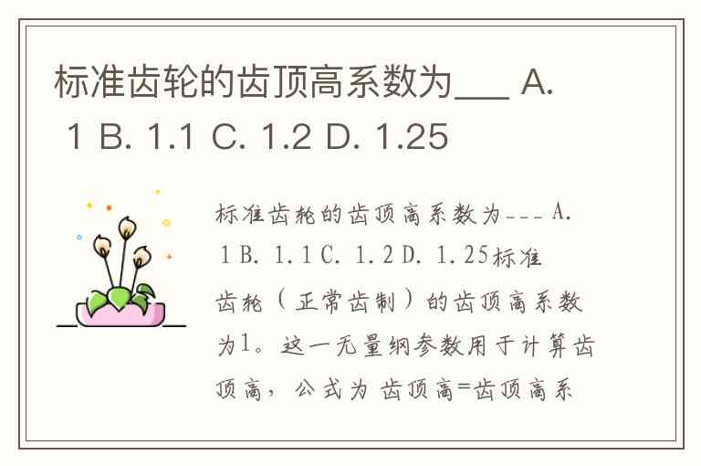 标准齿轮的齿顶高系数为___ A. 1 B. 1.1 C. 1.2 D. 1.25