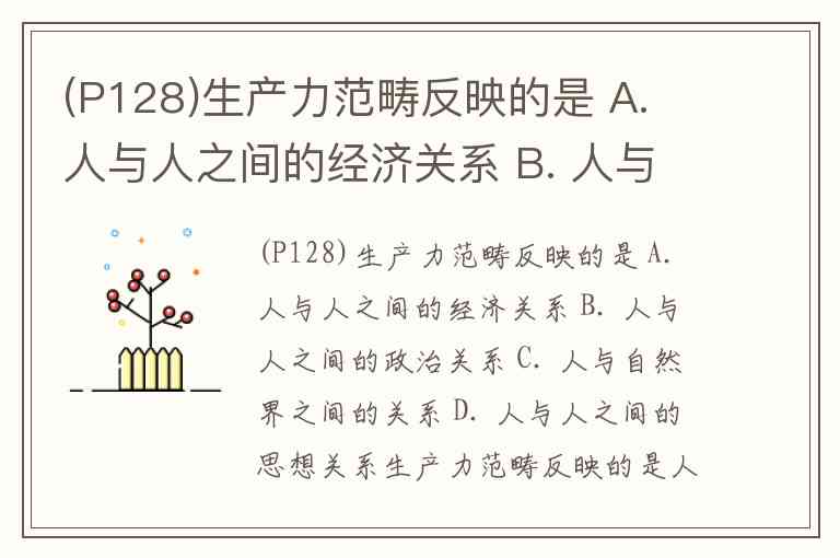 (P128)生产力范畴反映的是 A. 人与人之间的经济关系 B. 人与人之间的政治关系 C. 人与自然界之间的关系 D. 人与人之间的思想关系