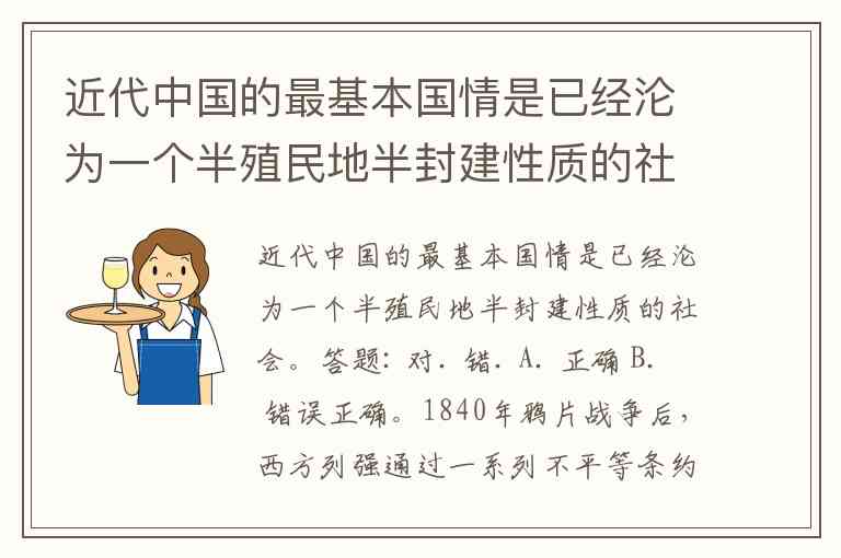 近代中国的最基本国情是已经沦为一个半殖民地半封建性质的社会。答题: 对. 错. A. 正确 B. 错误