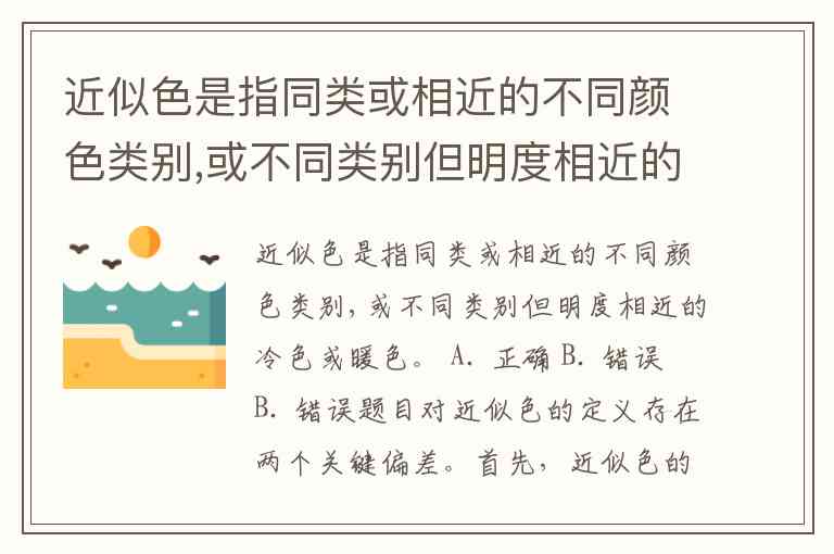 根据色彩理论,近似色的准确定义应为:色相环上相邻的颜色(通常夹角≤60°),或同一色相的不同明度/纯度变体。这一定义强调色相的关联性,而非冷暖属性或明度的孤立相似。