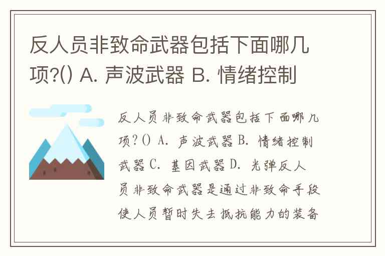 综上,正确答案为A(声波武器)和D(光弹)。这些武器通过物理性声光干扰实现非致命目标,而情绪控制武器和基因武器因技术属性或杀伤机制,不符合反人员非致命武器的定义。未来随着定向能技术发展,非致命武器的边界可能进一步拓展,但目前仍需以“可逆性失能”为核心判断标准。