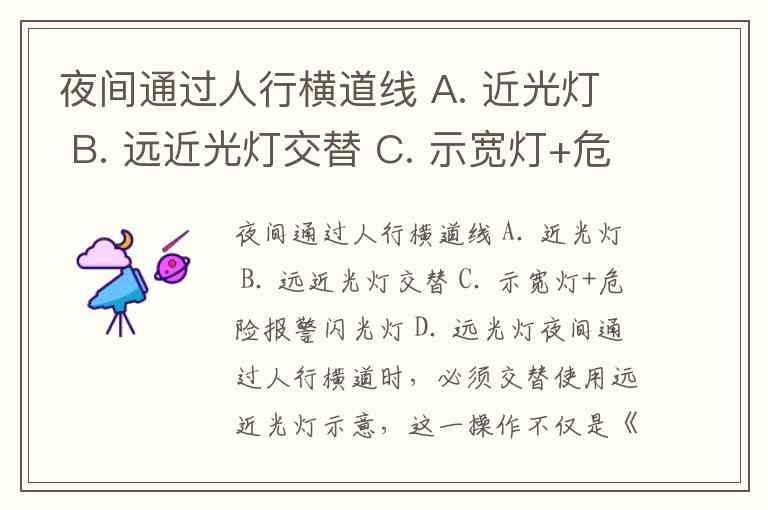 夜间通过人行横道线 A. 近光灯 B. 远近光灯交替 C. 示宽灯+危险报警闪光灯 D. 远光灯