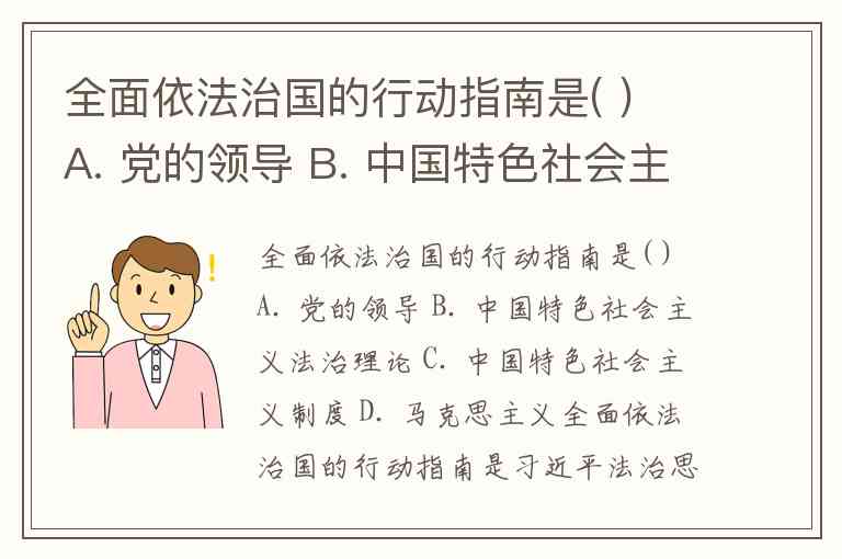 全面依法治国的行动指南是( ) A. 党的领导 B. 中国特色社会主义法治理论 C. 中国特色社会主义制度 D. 马克思主义