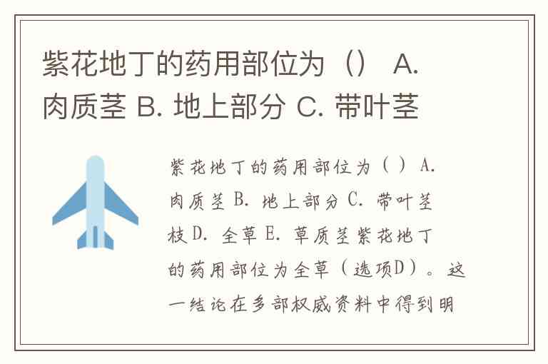 紫花地丁的药用部位为() A. 肉质茎 B. 地上部分 C. 带叶茎枝 D. 全草 E. 草质茎