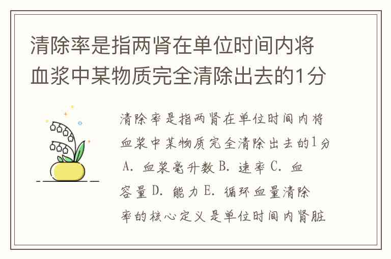 清除率是指两肾在单位时间内将血浆中某物质完全清除出去的1分 A. 血浆毫升数 B. 速率 C. 血容量 D. 能力 E. 循环血量