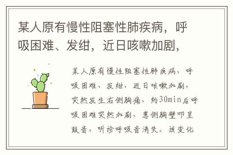 某人原有慢性阻塞性肺疾病,呼吸困难、发绀,近日咳嗽加剧,突然发生右侧胸痛,约30min后呼吸困难突然加剧,患侧胸壁叩呈鼓音,听诊呼吸音消失。该变化是 A. 自发性气胸 B. 肋间神经痛 C. 膈下脓肿 D. 腹水 E. 肋骨骨折