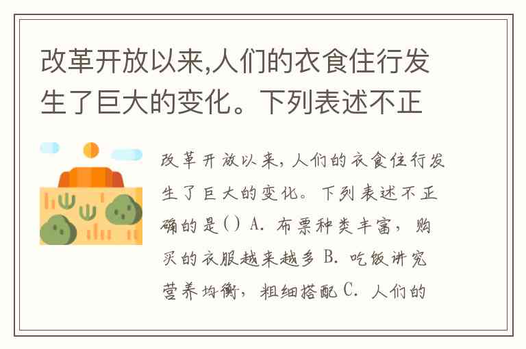 改革开放以来,人们的衣食住行发生了巨大的变化。下列表述不正确的是( ) A. 布票种类丰富,购买的衣服越来越多 B. 吃饭讲究营养均衡,粗细搭配 C. 人们的居住环境有了显著的改善 D. 开私家汽车出行的人越来越多