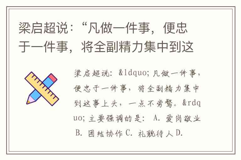 梁启超说:“凡做一件事,便忠于一件事,将全副精力集中到这事上头,一点不旁骛。”主要强调的是: A. 爱岗敬业 B. 团结协作 C. 礼貌待人 D. 以身作则