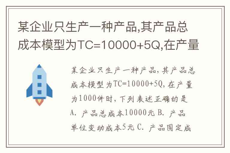 某企业只生产一种产品,其产品总成本模型为TC=10000+5Q,在产量为1000件时,下列表述正确的是 A. 产品总成本10000元 B. 产品单位变动成本5元 C. 产品固定成本总额5000元 D. 产品变动成本总额15000元