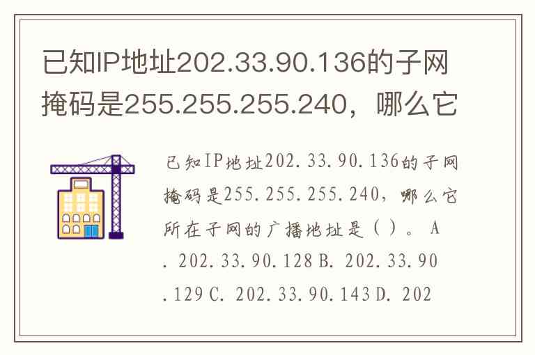 已知IP地址202.33.90.136的子网掩码是255.255.255.240,哪么它所在子网的广播地址是()。 A. 202.33.90.128 B. 202.33.90.129 C. 202.33.90.143 D. 202.33.90.144