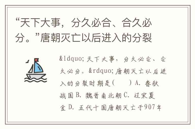 “天下大事,分久必合、合久必分。”唐朝灭亡以后进入的分裂时期是( ) A. 春秋战国 B. 魏晋南北朝 C. 辽宋夏金 D. 五代十国