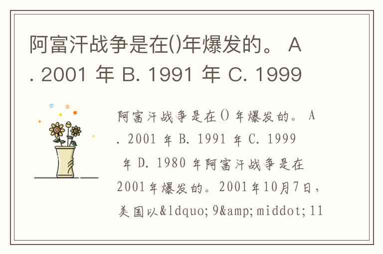 阿富汗战争是在()年爆发的。 A. 2001 年 B. 1991 年 C. 1999 年 D. 1980 年