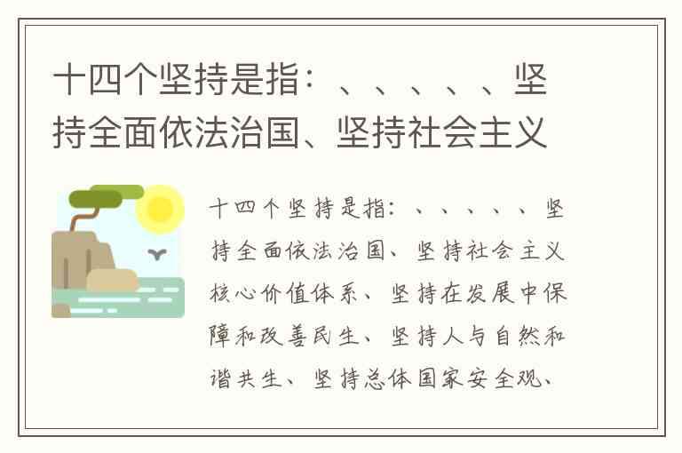 十四个坚持是指:、、、、、坚持全面依法治国、坚持社会主义核心价值体系、坚持在发展中保障和改善民生、坚持人与自然和谐共生、坚持总体国家安全观、坚持党对人民的绝对领导、坚持“”和推进祖国统一、坚持推动构建人类命运共同体、坚持全面从严治党 A. 坚持党对一切工作的领导 B. 坚持以人民为中心 C. 坚持全面深化改革 D. 坚持新发展理念 E. 坚持人民当家作主