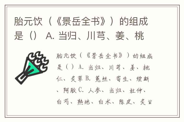 胎元饮(《景岳全书》)的组成是 人参、当归、杜仲、白芍、熟地、白术、陈皮、炙甘草,对应选项 C。这一经典方剂出自明代张景岳的《景岳全书》,其配伍严谨,以补气养血与补肾安胎为核心功效。