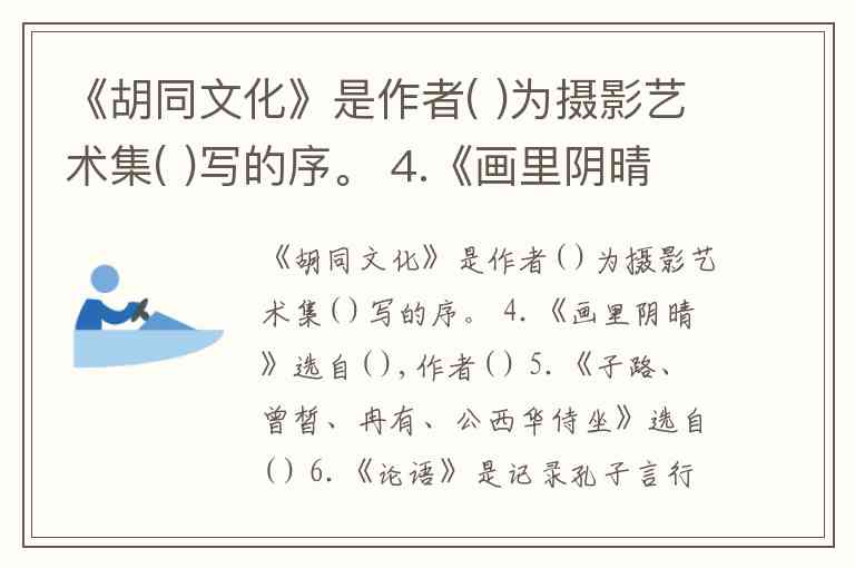 《胡同文化》是作者( )为摄影艺术集( )写的序。 4.《画里阴晴》选自( ),作者( ) 5.《子路、曾皙、冉有、公西华侍坐》选自( ) 6.《论语》是记录孔子言行的( )体散文集。