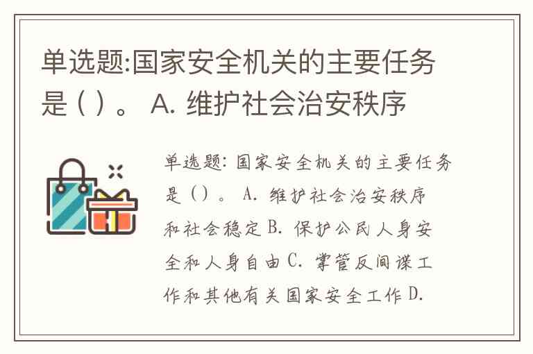 单选题:国家安全机关的主要任务是 ( ) 。 A. 维护社会治安秩序和社会稳定 B. 保护公民人身安全和人身自由 C. 掌管反间谍工作和其他有关国家安全工作 D. 保护公共财产和个人合法财产