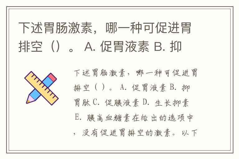 下述胃肠激素,哪一种可促进胃排空()。 A. 促胃液素 B. 抑胃肽 C. 促胰液素 D. 生长抑素 E. 胰高血糖素