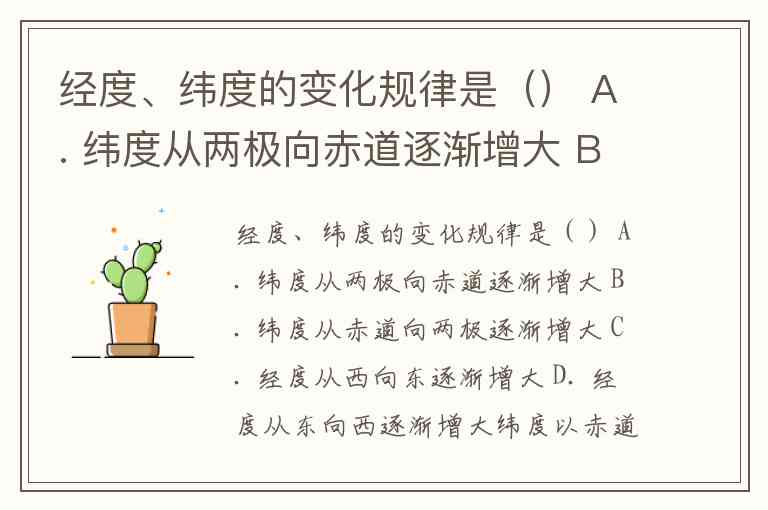 经度、纬度的变化规律是() A. 纬度从两极向赤道逐渐增大 B. 纬度从赤道向两极逐渐增大 C. 经度从西向东逐渐增大 D. 经度从东向西逐渐增大