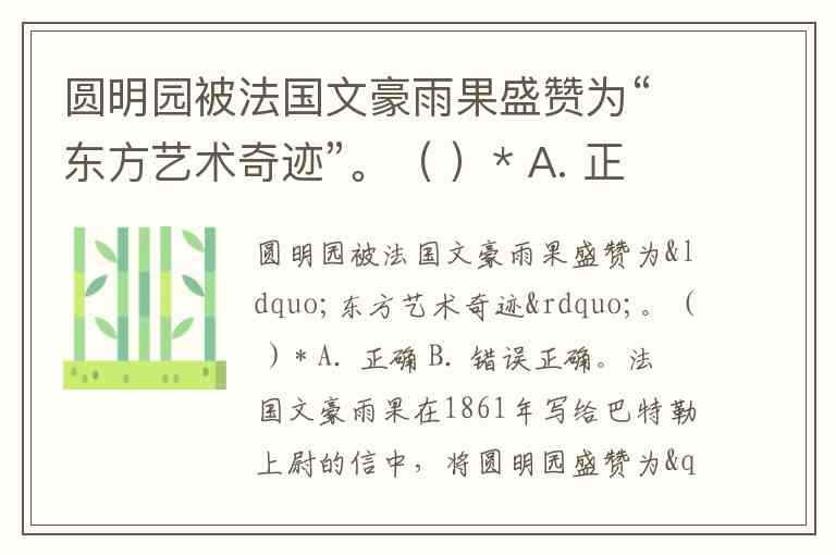 圆明园被法国文豪雨果盛赞为“东方艺术奇迹”。( )* A. 正确 B. 错误
