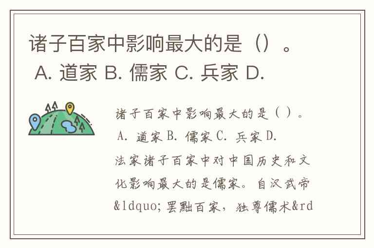 诸子百家中影响最大的是()。 A. 道家 B. 儒家 C. 兵家 D. 法家