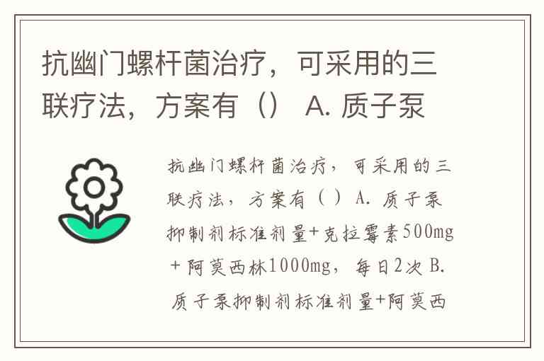 幽门螺杆菌三联疗法的核心是1种质子泵抑制剂(PPI)联合2种抗生素,通过抑制胃酸并协同杀菌实现根除目标。根据临床研究和用药规范,以下是对各选项的具体分析: