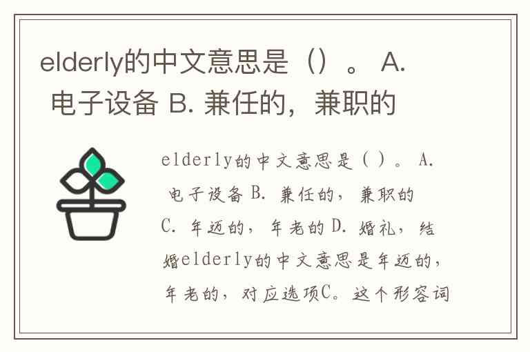 elderly的中文意思是()。 A. 电子设备 B. 兼任的,兼职的 C. 年迈的,年老的 D. 婚礼,结婚