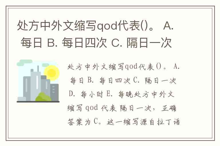 处方中外文缩写 qod 代表 隔日一次,正确答案为 C。这一缩写源自拉丁语“quaque altera die”,是医疗文书中用于明确用药、治疗或检查频率的标准化术语。