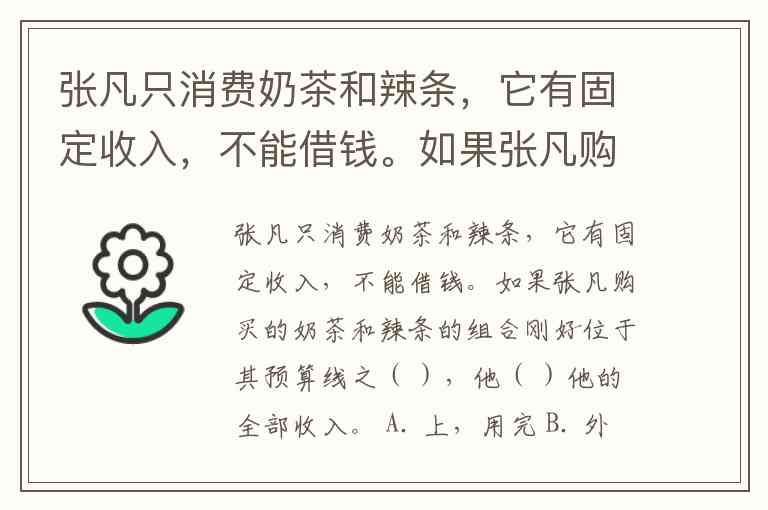 张凡只消费奶茶和辣条,它有固定收入,不能借钱。如果张凡购买的奶茶和辣条的组合刚好位于其预算线之( ),他( )他的全部收入。 A. 上,用完 B. 外,未用完 C. 上,未用完 D. 内,用完