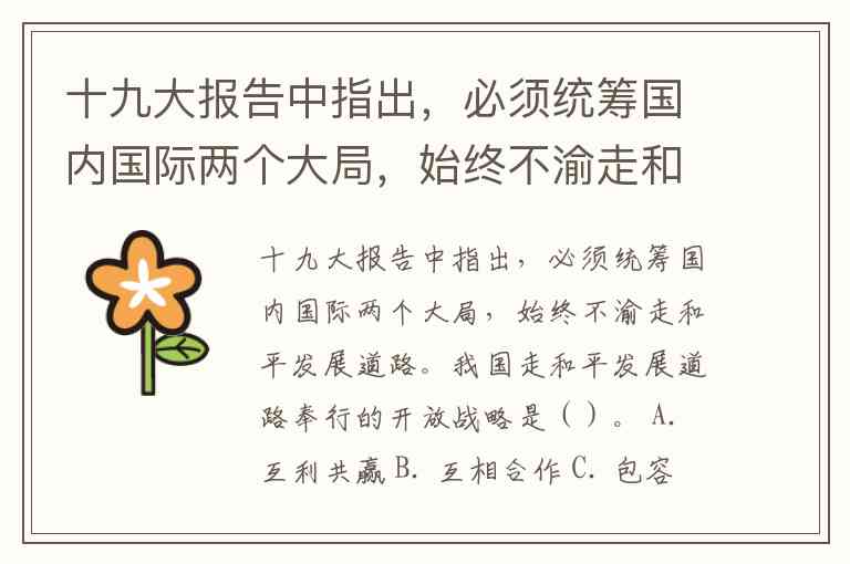十九大报告中指出,必须统筹国内国际两个大局,始终不渝走和平发展道路。我国走和平发展道路奉行的开放战略是()。 A. 互利共赢 B. 互相合作 C. 包容互信 D. 开放共赢