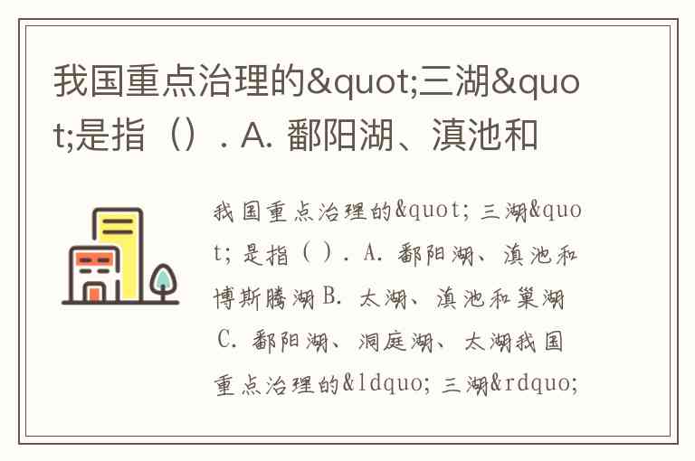我国重点治理的"三湖"是指(). A. 鄱阳湖、滇池和博斯腾湖 B. 太湖、滇池和巢湖 C. 鄱阳湖、洞庭湖、太湖