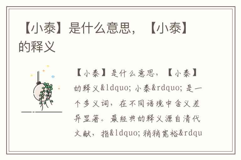 “小泰”是一个多义词,在不同语境中含义差异显著。最经典的释义源自清代文献,指“稍稍宽裕”的生活状态,这一用法在《聊斋志异》中多次出现,比如《雷曹》篇“操业半年,家赀小泰”和《胡四娘》篇“幸囊资小泰,携卷入都”,描述的都是经济状况略有改善的情形。