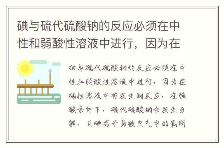 A. 正确。碘与硫代硫酸钠的反应(2Na₂S₂O₃ + I₂ = Na₂S₄O₆ + 2NaI)需在中性或弱酸性条件下进行,这一结论可通过分析不同pH环境下的反应行为证实。