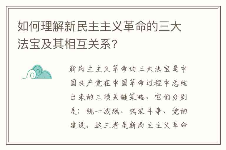 新民主主义革命的三大法宝是中国共产党在中国革命过程中总结出来的三项关键策略,它们分别是:统一战线、武装斗争、党的建设。这三者是新民主主义革命能够成功的核心要素,它们相互联系、相互作用,共同推动了革命的胜利。