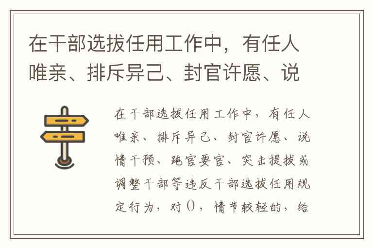 根据党内相关规定和制度,在干部选拔任用过程中,涉及到的违纪行为(如任人唯亲、排斥异己、说情干预等)通常需要根据行为的性质和情节对相关责任人进行处分。