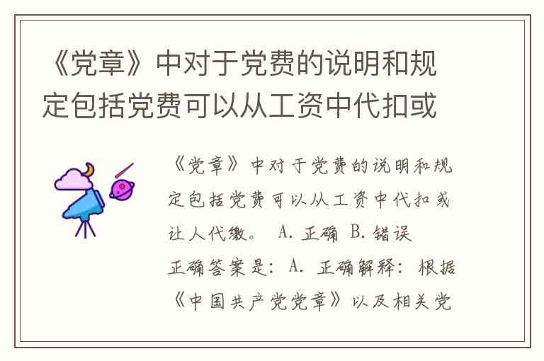 《党章》中对于党费的说明和规定包括党费可以从工资中代扣或让人代缴。 A.正确 B.错误