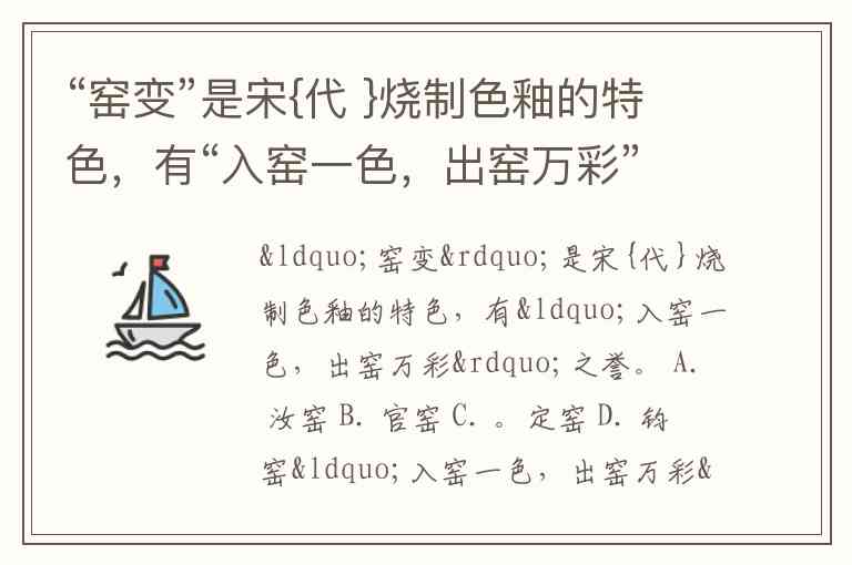 “窑变”是宋{代 }烧制色釉的特色,有“入窑一色,出窑万彩”之誉。 A. 汝窑 B. 官窑 C. 。定窑 D. 钧窑
