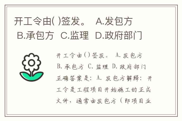 开工令是工程项目开始施工的正式文件,通常由发包方(即项目业主或建设单位)签发。在工程建设中,发包方负责安排项目的各项工作,包括确定施工开始的时间和发出相关指令。开工令的签发标志着工程正式进入施工阶段。