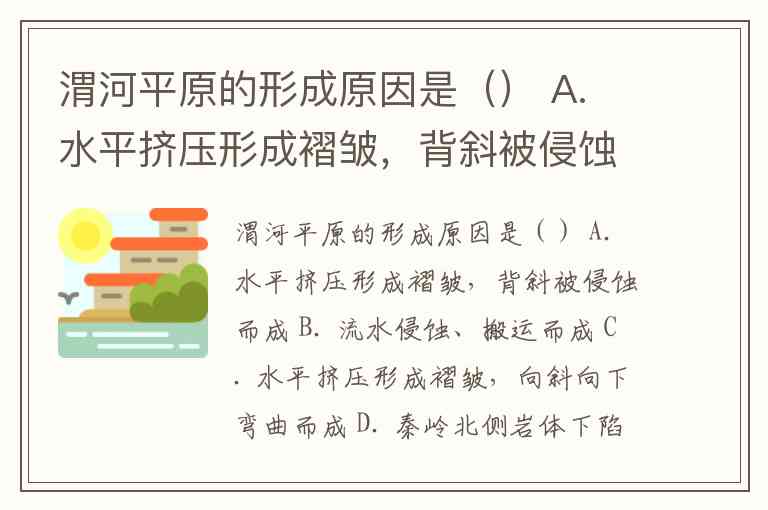 渭河平原的形成原因是() A. 水平挤压形成褶皱,背斜被侵蚀而成 B. 流水侵蚀、搬运而成 C. 水平挤压形成褶皱,向斜向下弯曲而成 D. 秦岭北侧岩体下陷,渭河携带泥沙沉积而成