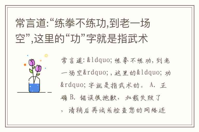常言道:“练拳不练功,到老一场空”,这里的“功”字就是指武术的。 A. 正确 B. 错误