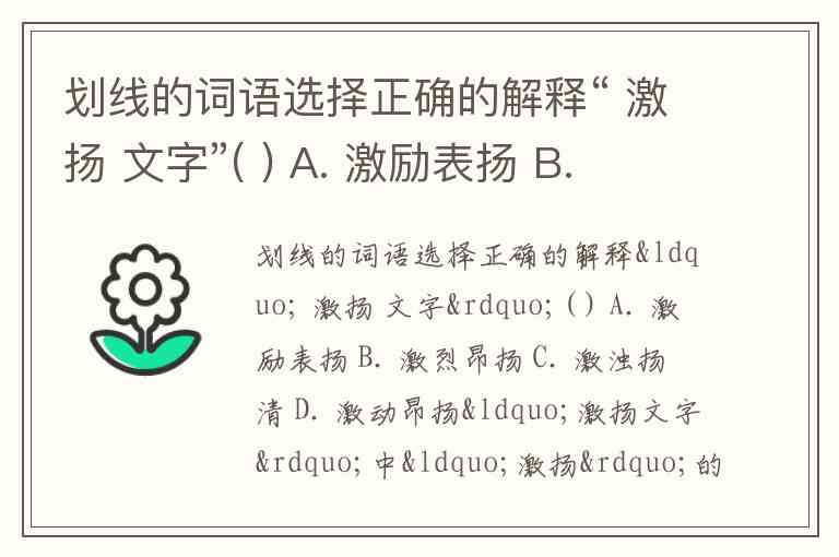 划线的词语选择正确的解释“ 激扬 文字”( ) A. 激励表扬 B. 激烈昂扬 C. 激浊扬清 D. 激动昂扬