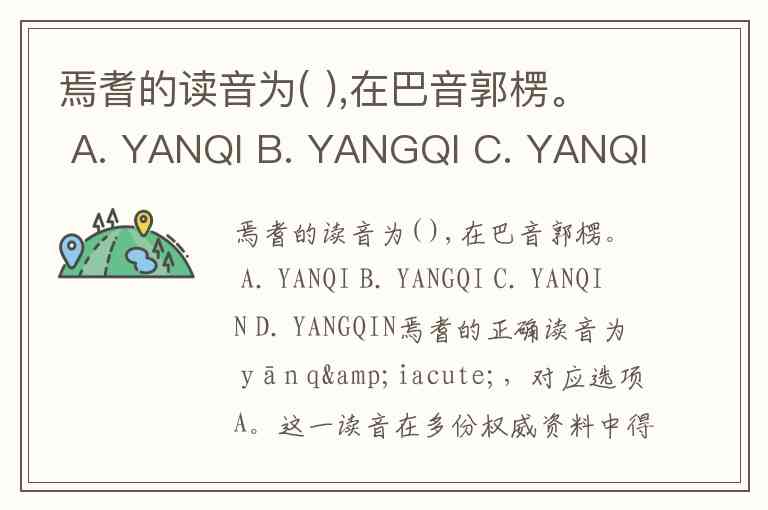 焉耆的读音为( ),在巴音郭楞。 A. YANQI B. YANGQI C. YANQIN D. YANGQIN