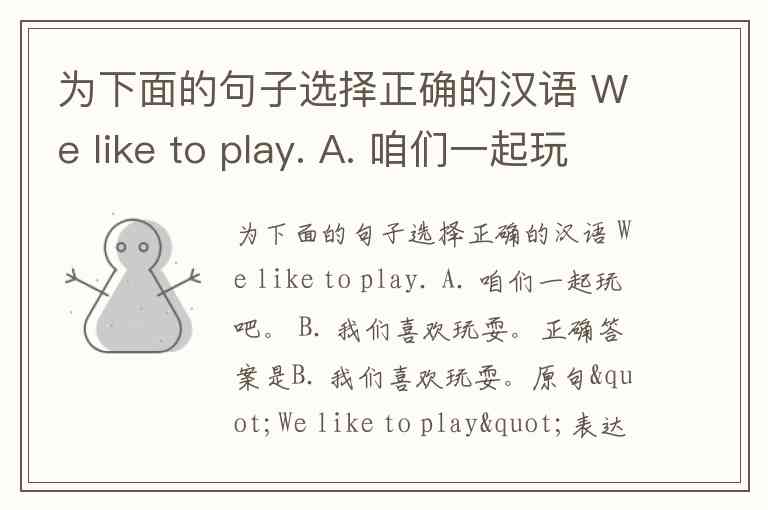 为下面的句子选择正确的汉语 We like to play. A. 咱们一起玩吧。 B. 我们喜欢玩耍。