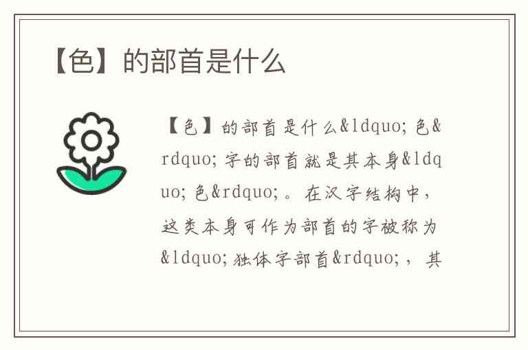 “色”字的部首就是其本身“色”。在汉字结构中,这类本身可作为部首的字被称为“独体字部首”,其部首笔划数等于总笔划数(6画)。这种情况常见于一些构字能力强的基础汉字,例如“日”“月”“水”等,它们既可以独立成字,又能作为其他汉字的构字部件。