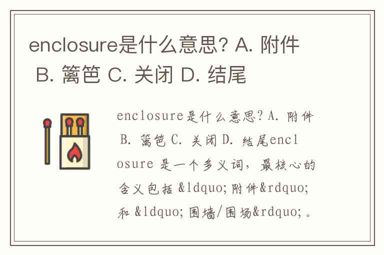 总结:若在信件末尾看到此词,大概率指“附件”(选项A);若描述物理空间,则可能是“围墙/围场”(选项B)。其他选项“关闭”(C)和“结尾”(D)并非其标准释义。你认为这个词在 "We need to build an enclosure for the livestock" 中应如何理解?