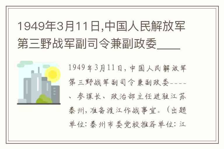 1949年3月11日,中国人民解放军第三野战军副司令兼副政委粟裕、参谋长张震、政治部主任唐亮进驻江苏泰州,准备渡江作战事宜。这一历史细节明确记载于中共泰州市委党校提供的权威试题资料中,同时与渡江战役的指挥体系高度吻合。