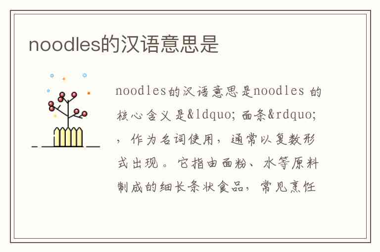 noodles 的核心含义是“面条”,作为名词使用,通常以复数形式出现 。它指由面粉、水等原料制成的细长条状食品,常见烹饪方式包括煮、炒等,例如 "I had a bowl of noodles for lunch"(我午餐吃了一碗面条)。